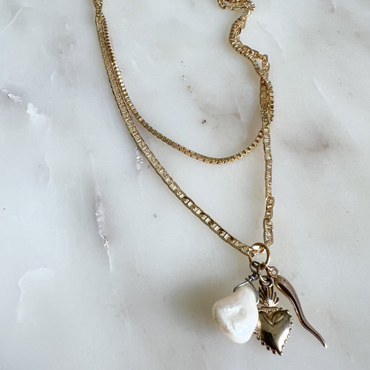 Classic Scared Heart Italian Horn Freshwater Pearl Charm Necklace