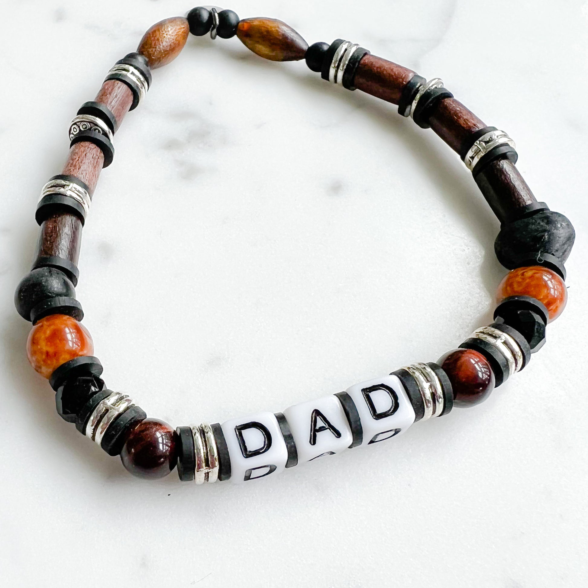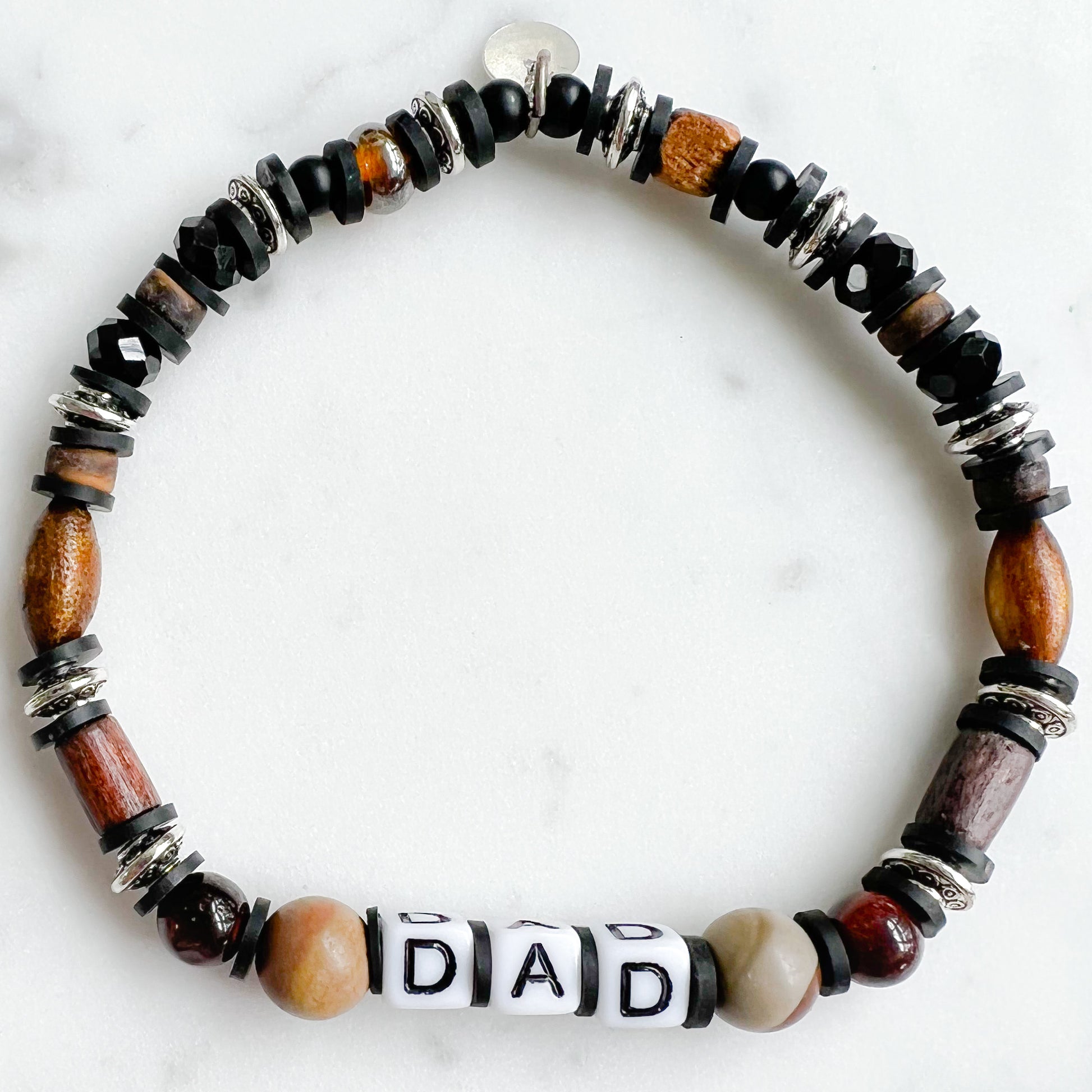 Tiger eye, picasso jasper, rosewood, black onyx, brass and sustainable wood bead bracelet.