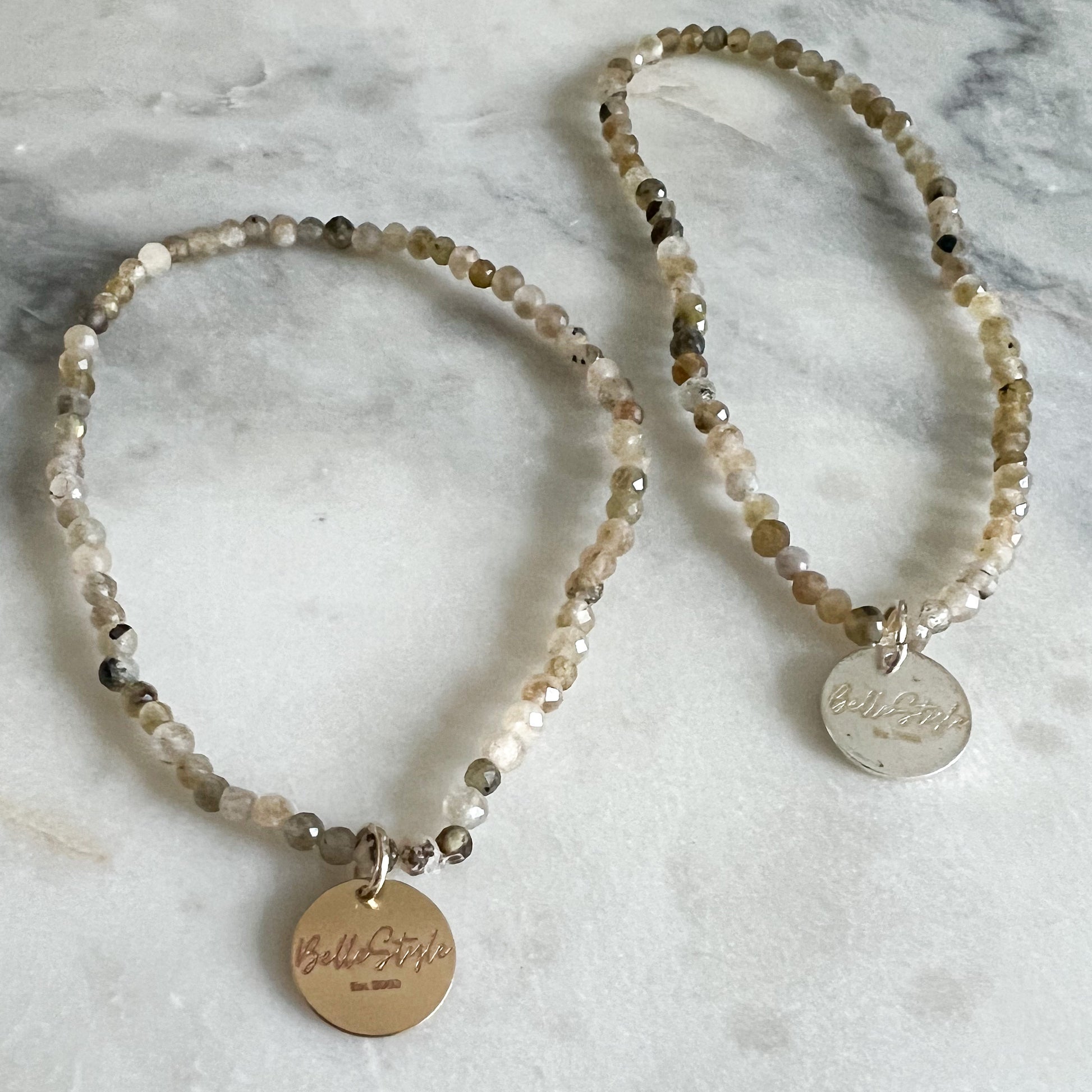 Unleash a little bit of sparkle into your wardrobe with this Micro Labradorite Logo Bracelet. Featuring a semi-precious stone, this bracelet is sure to dazzle and shine with every move! Whether you're headed out for a night on the town or just wanting to spruce up your everyday look, this is the perfect accessory to add just the right amount of glitz and glam!