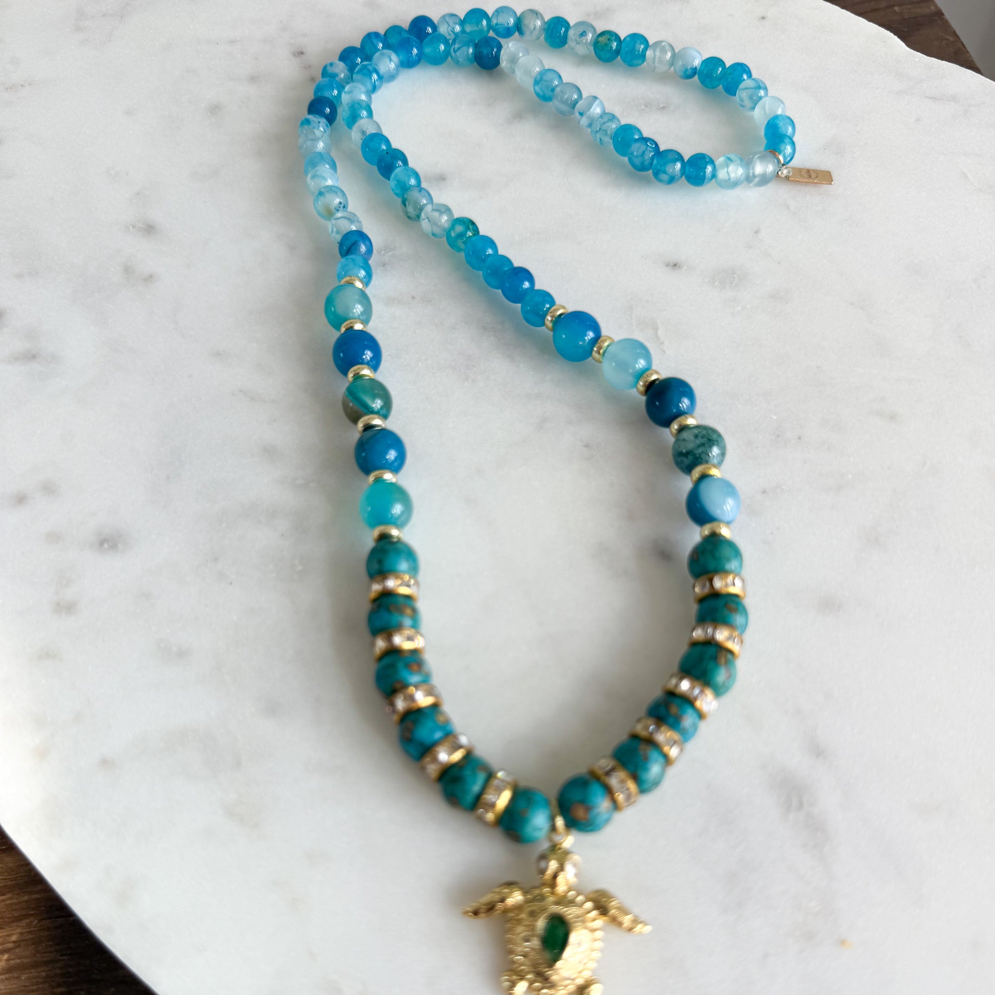 Atlantis Emerald Green Crystal Gold Turtle Charm Blue Chalcedony Necklace