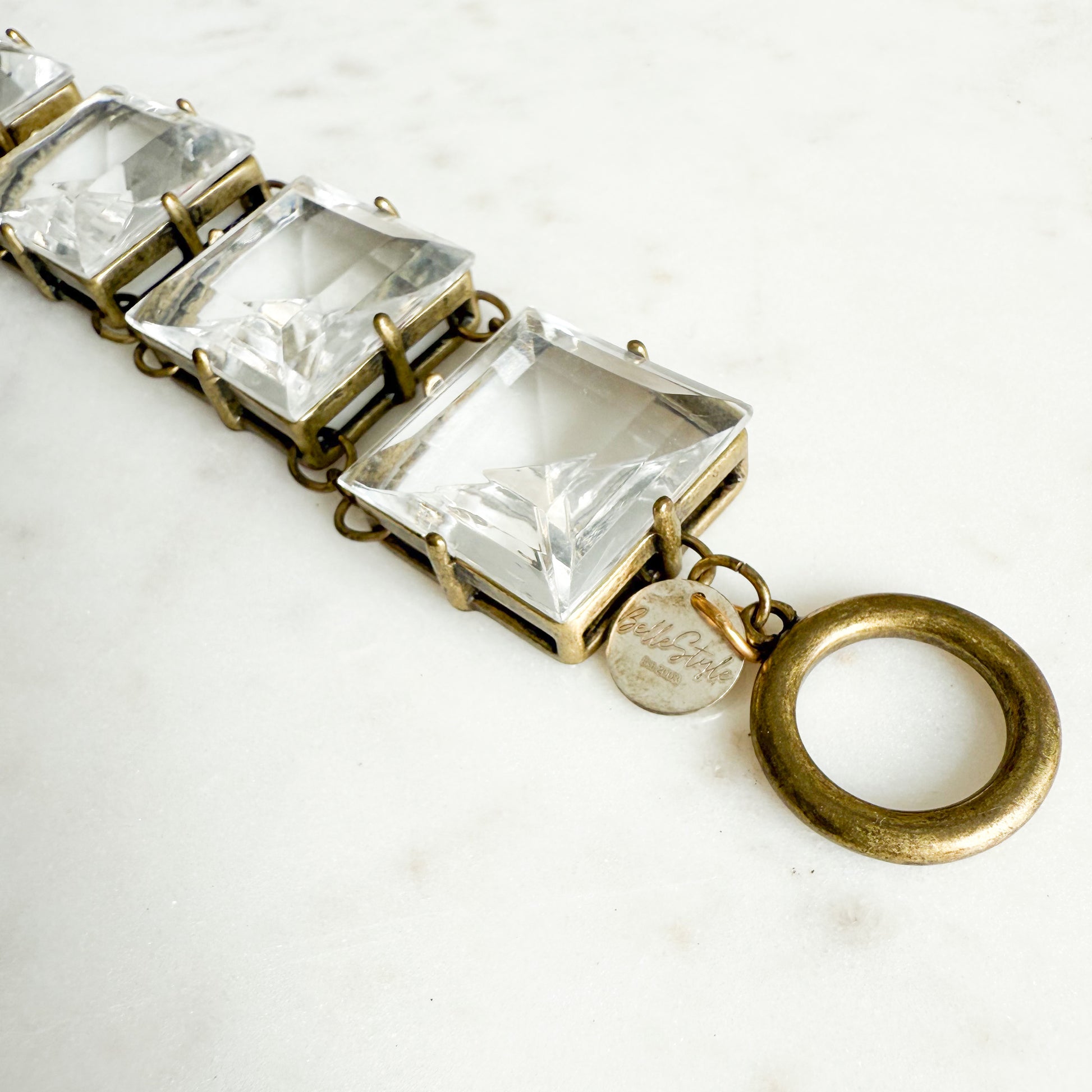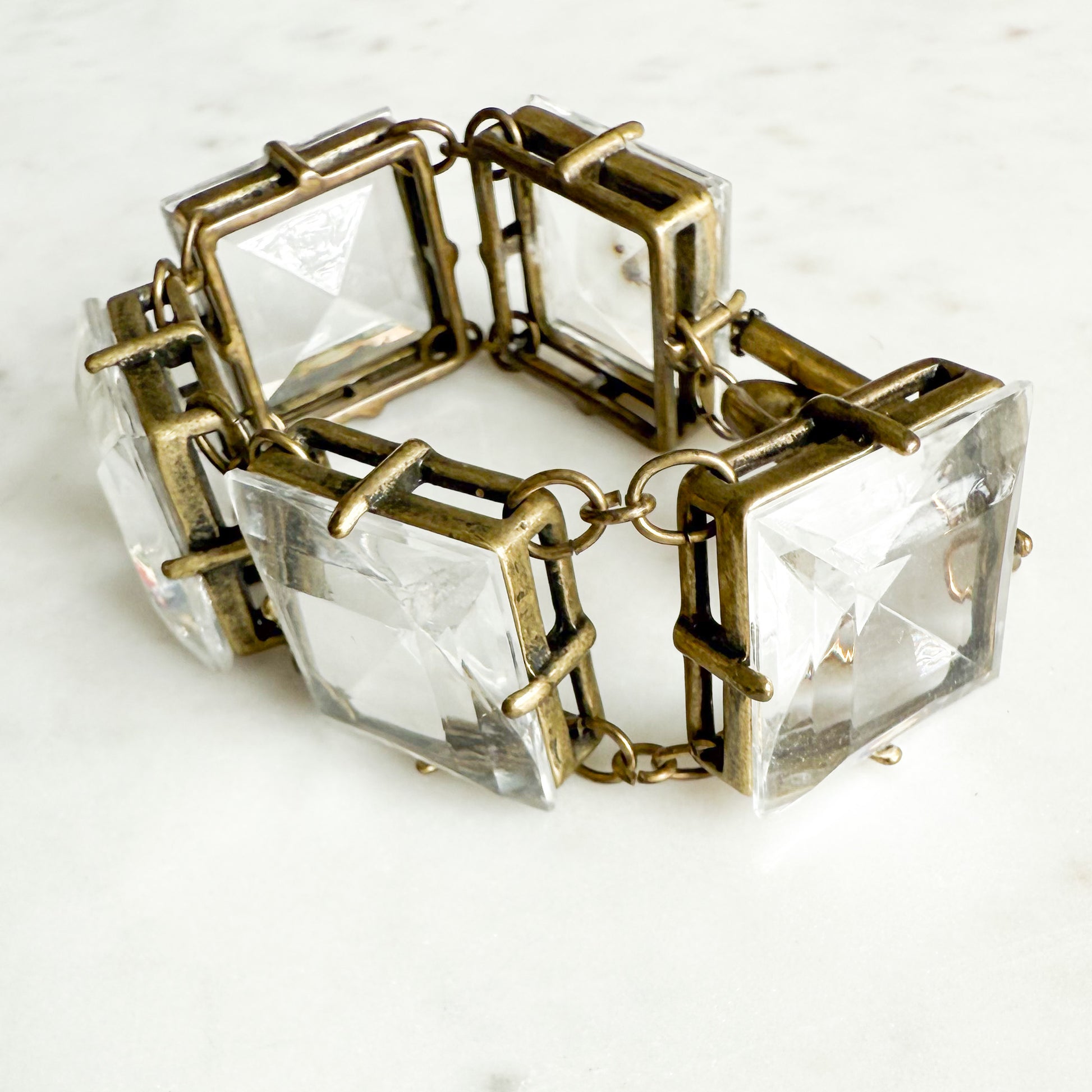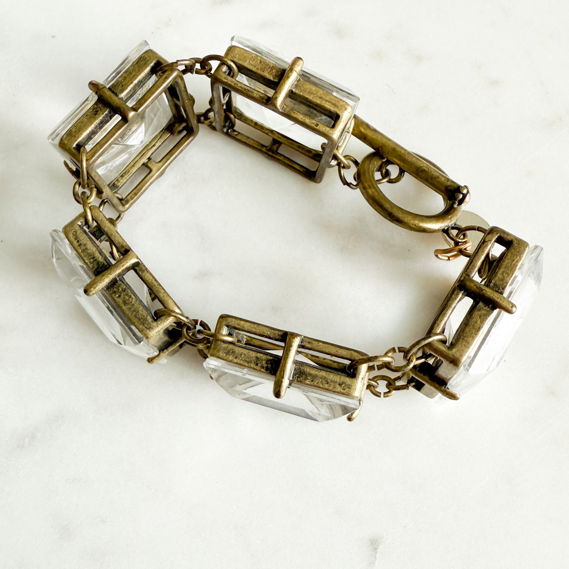 Discover timeless elegance with this archival-quality bracelet, featuring substantial square crystals set in warm patina bronze. Each piece showcases a sterling silver 925 logo tag, marking it as a collectible treasure. The chunky, vintage-inspired design exudes sophistication while its unique construction ensures no two bracelets are identical. A statement piece that transcends trends, perfect for those who appreciate craftsmanship and enduring style.
