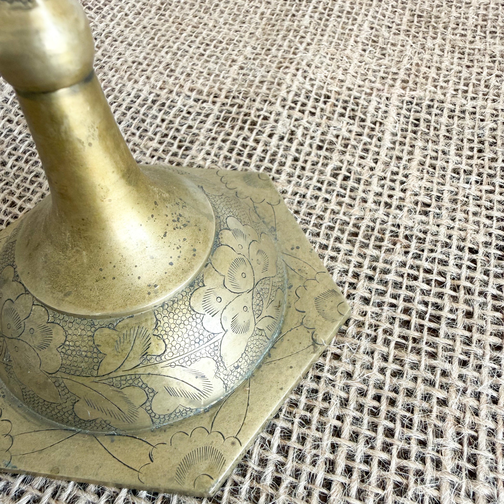 Floral etched design vintage brass candle holder with white candlestick included. Heavy, durable design. Feature on a table scape, mantle or office for historic and romantic feel to any space. Instant conversation starter. One of a kind. Measures 9.5” tall. Comes boxed. Sustainable home decor. Made in China.  Stamped. Sourced in USA. Made in the 1930’s during the Art Deco period.