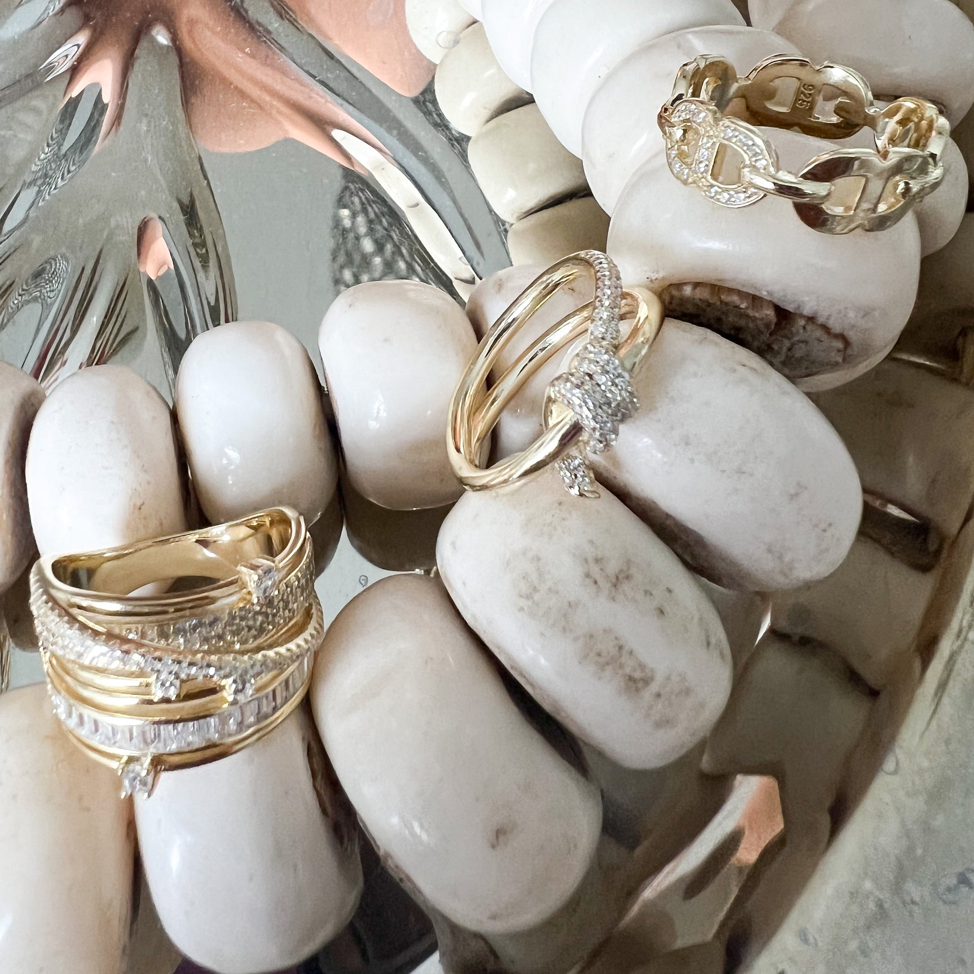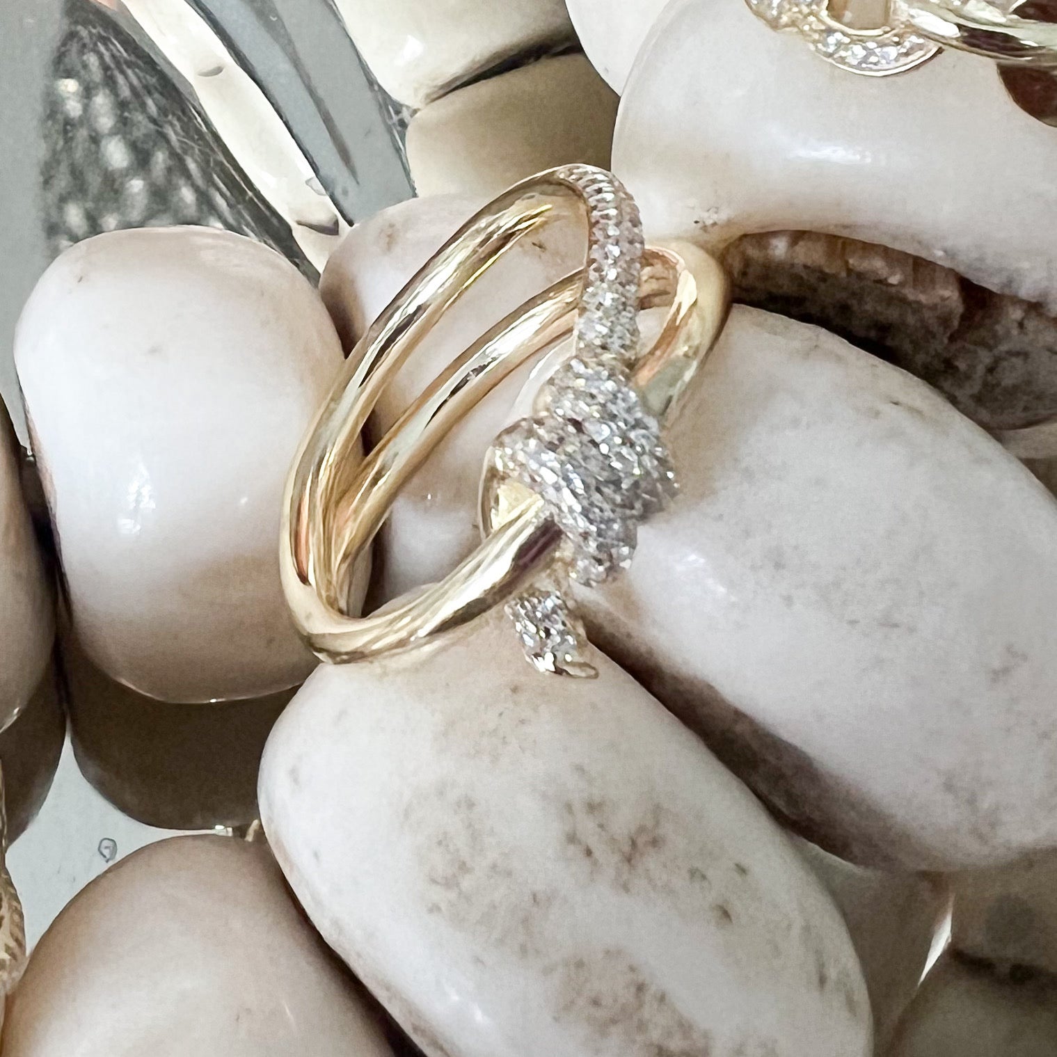 This sophisticated Knot Gold Sterling Silver 925 Ring is crafted from a luxurious sterling silver design. An asymmetrical band holds the glimmering cubic zirconia crystals, complemented with a classic gold knot. Stamped with 925 for authenticity, this ring is perfect for a special occasion.