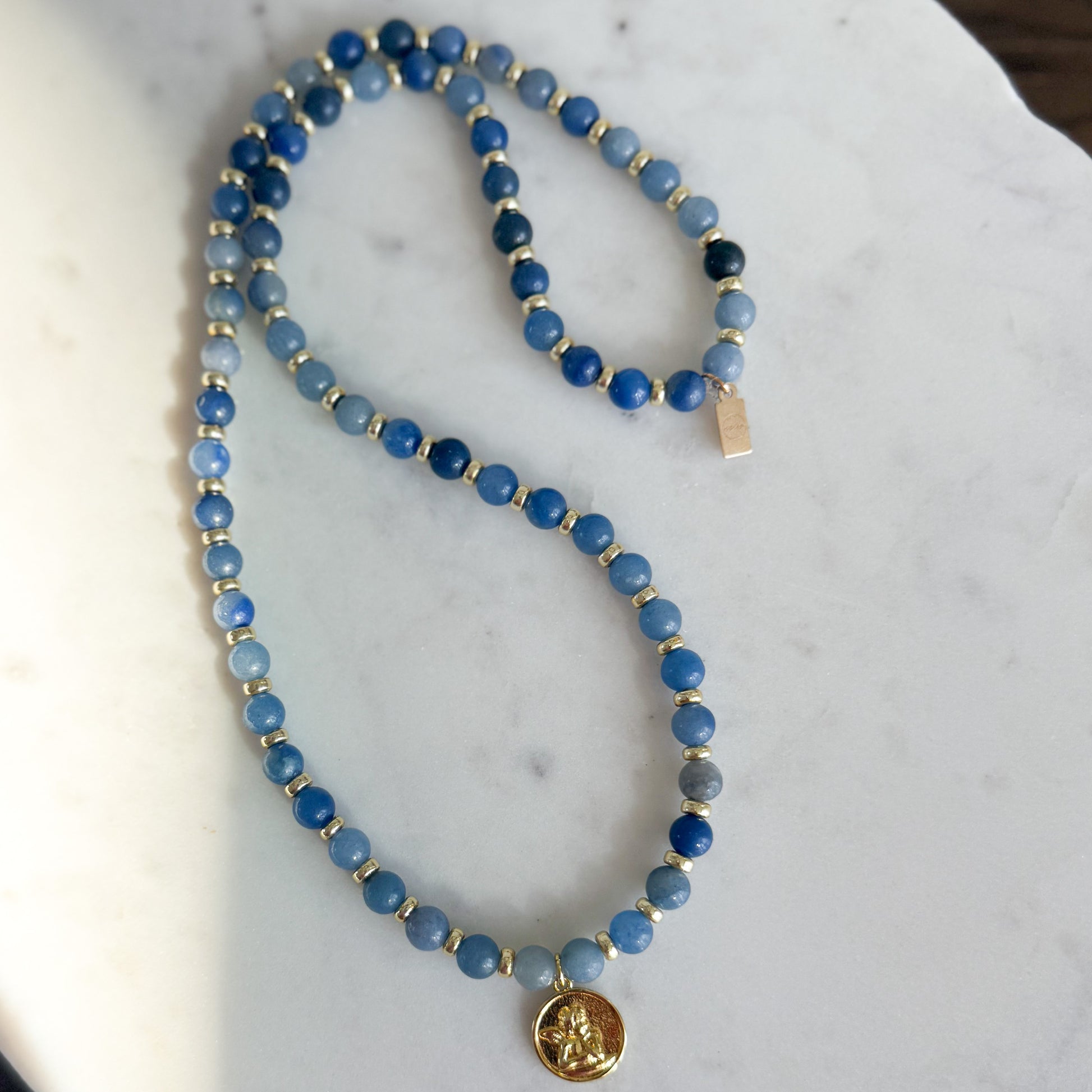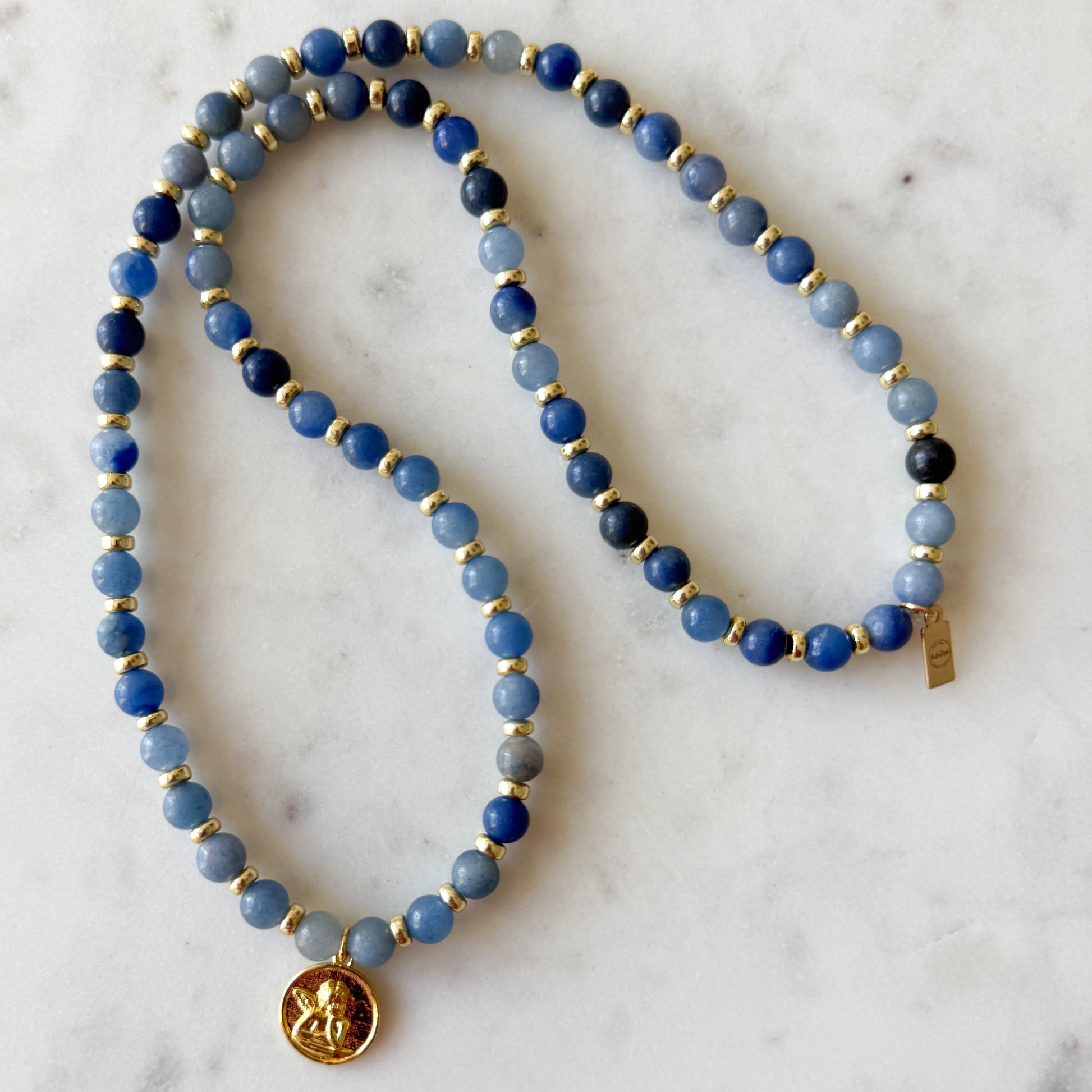 Semi-precious stone chain with blue chalcedony 6mm beads throughout. Features 14KTGF BelleStyle logo charm. Comfort design, slip over the head. Waterproof. Features a gold round Sistine Chapel Michelangelo Angelface charm.
