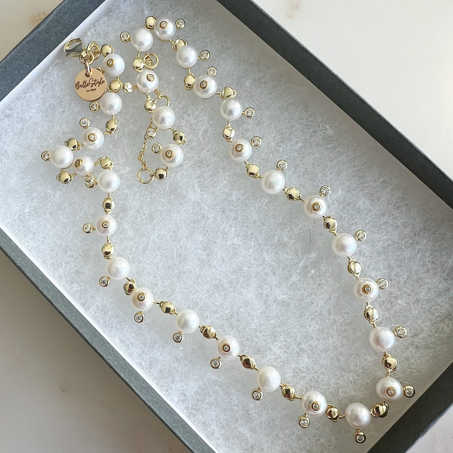 Introducing the Victoria Freshwater Pearl Crystal Necklace – a timelessly elegant piece that will refine any ensemble. Crafted from sterling silver and plated in gold, this necklace is sure to dazzle with its freshwater pearl centerpiece and 14K gold logo charm. Perfect for special occasions, it is the perfect accessory to add sophistication and class to your wardrobe.